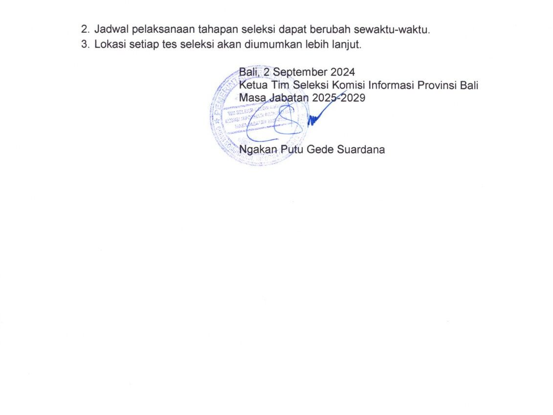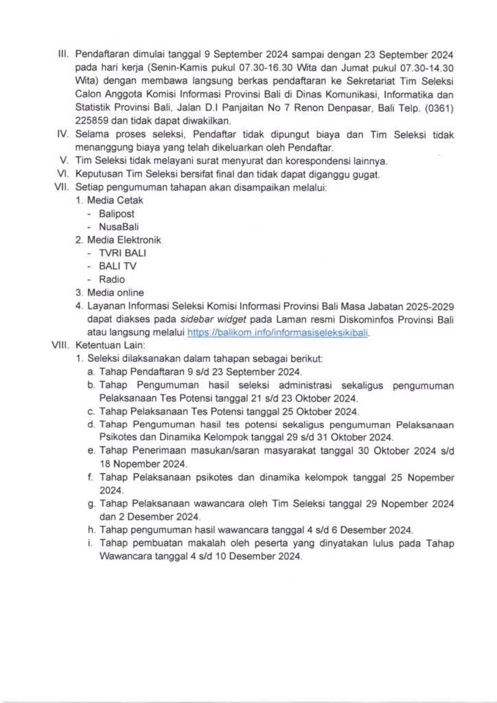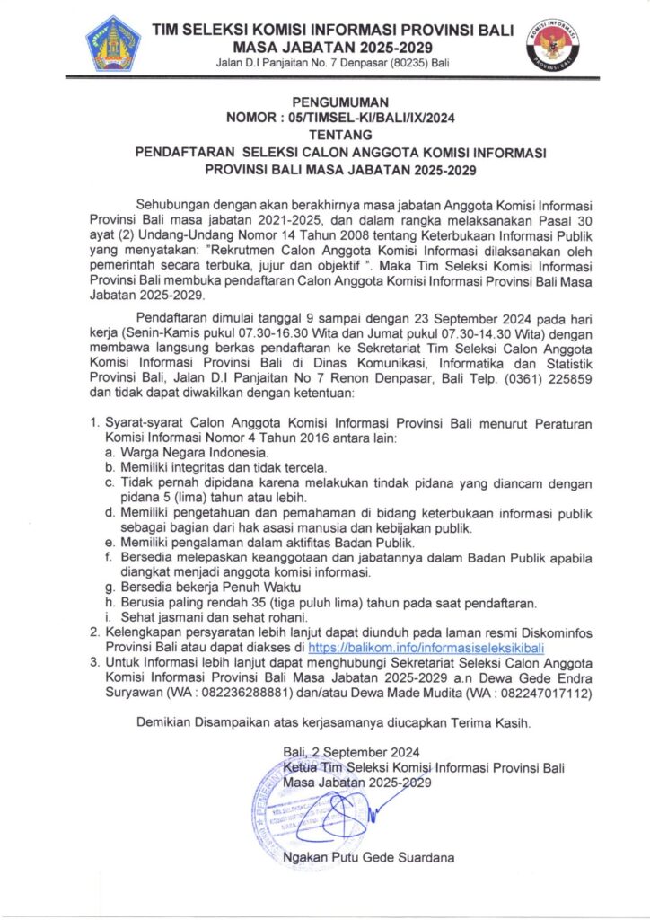 Berkas & PengumumanPengumuman Pendaftaran Seleksi Calon Anggota Komisi Informasi Provinsi Bali Masa Jabatan 2025-2029 Senin, 2 September 2024Senin, 23 September 2024 Download Pengumuman Download Formulir Pendaftaran