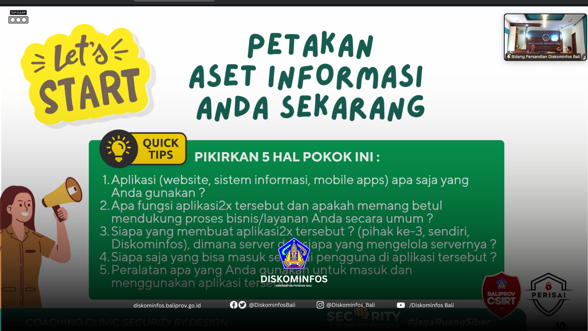 Diskominfos Provinsi Bali melalui pendekatan Security by Design berupaya meningkatkan kesadaran dan kapasitas Perangkat Daerah dalam melakukan pendataan serta pengamanan aset informasi. Upaya ini menjadi bagian dari komitmen Pemerintah Provinsi Bali dalam menjaga ruang siber yang aman, tangguh, dan terpercaya. (gkn)