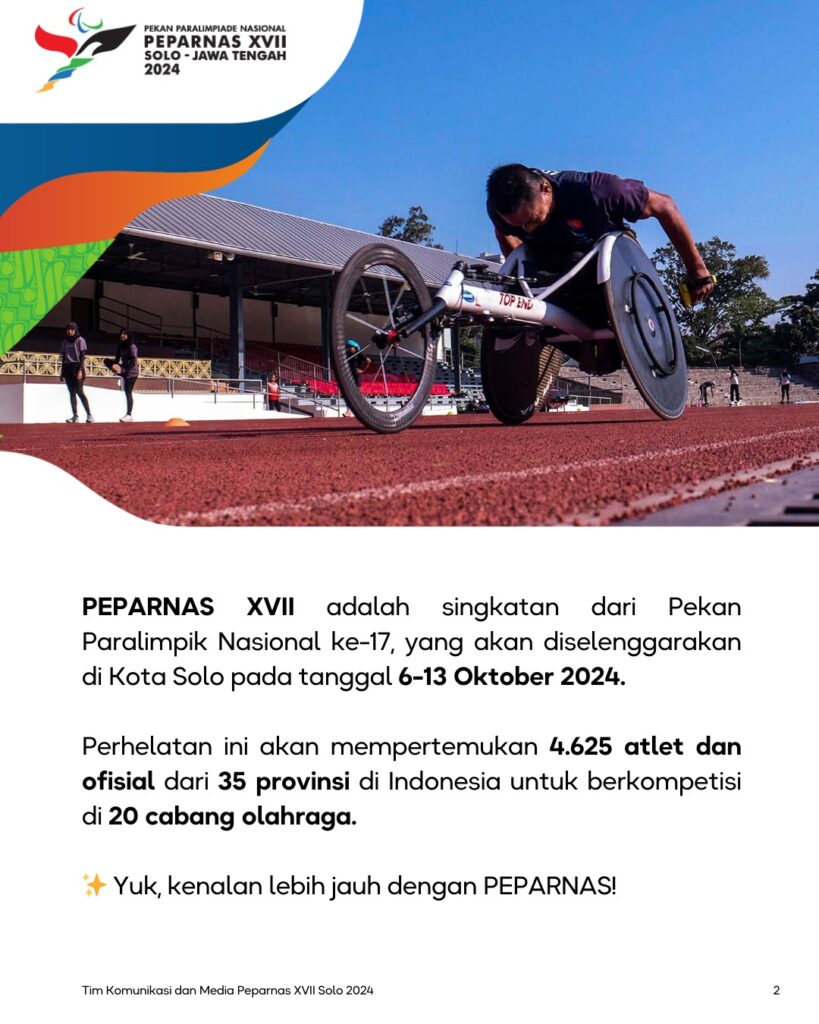 PEPARNAS XVII adalah singkatan dari Pekan Paralimpik Nasional ke-17, yang akan diselenggarakan di Kota Solo pada tanggal 6-13 Oktober 2024.